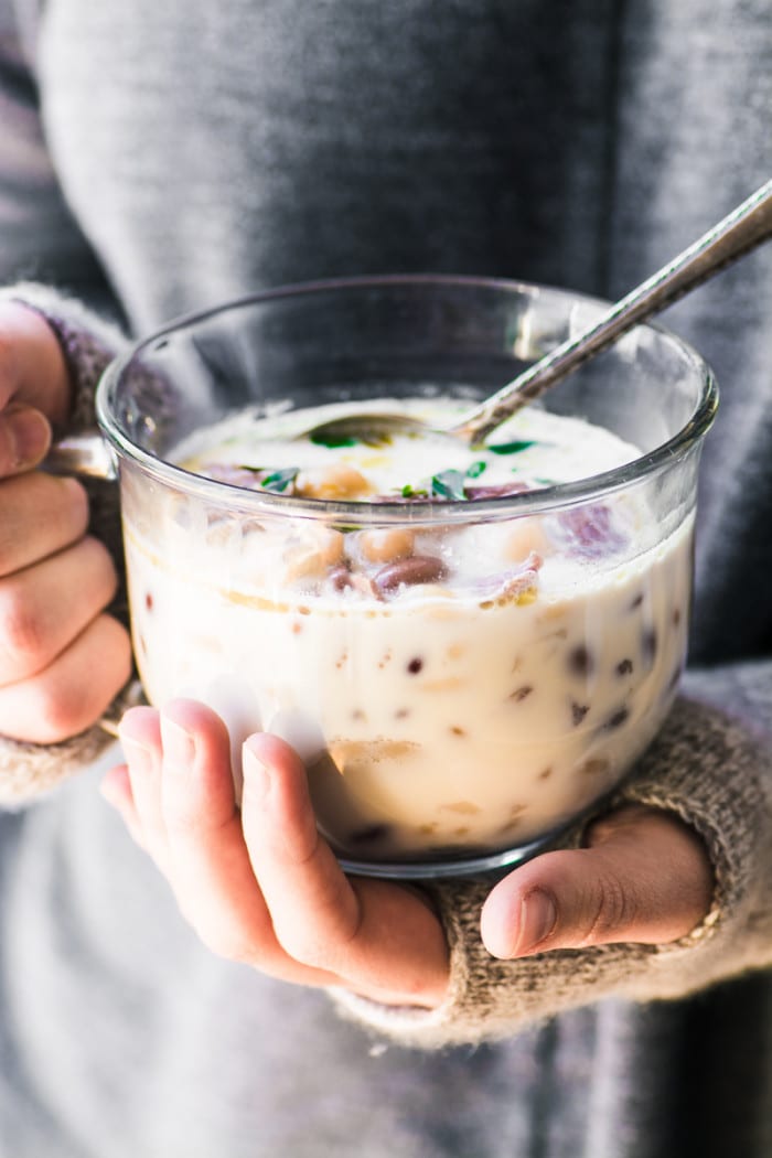 Esta es una sopa muy simple con un sabor limpio y ligero. De hecho, he estado debatiendo si incluir el mundo “cremoso” en el título porque no es pesado ni denso como la crema tradicional o la sopa de frijoles, tiene una textura más espumosa. El jamón le da un sabor único y todo queda sencillamente delicioso.