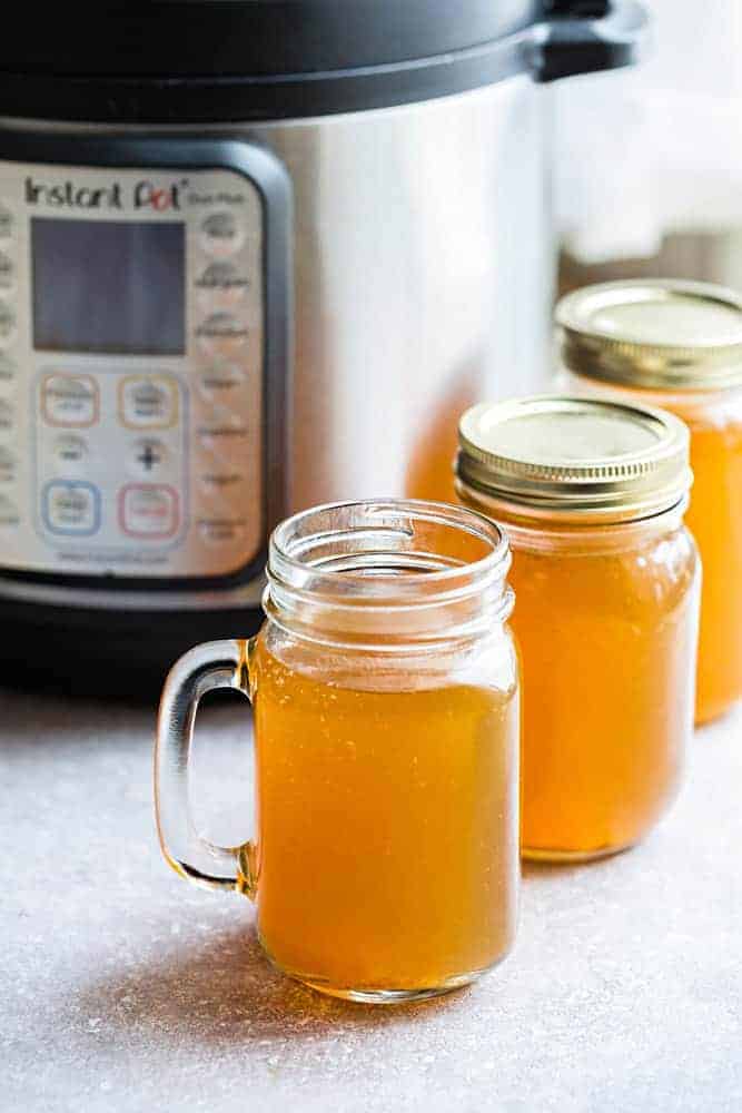 Me encanta hacer un lote de caldo de pollo presurizado para guardar en el congelador. Al final, no solo cocina un pollo entero, sino que también garantiza un caldo limpio compatible con paleo/keto/Whole30.