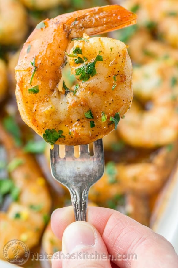 Precaliente el horno a 450˚F. Transfiera los camarones a una sartén lo suficientemente grande como para contener los camarones en una sola capa. Cocine sin tapar hasta que cuaje (8-10 minutos). No los cocine demasiado o los camarones pueden volverse masticables. Espolvorea la parte superior con la guarnición opcional y sirve. PD La salsa que queda en la sartén hace una gran salsa de pan :).