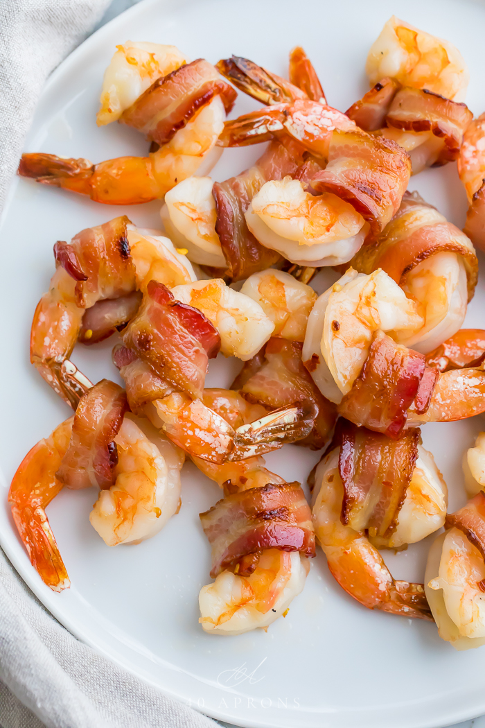- Encienda el horno a la parrilla y cocine las gambas, a unos 10 ″ de la fuente de calor, unos 5-8 minutos, volteando las gambas a la mitad, hasta que el tocino esté crujiente.
