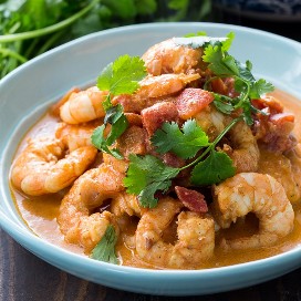 La salsa de crema de tomate está aromatizada con cebollino, ajo, jengibre recién rallado, hojuelas de chile y ralladura de limón. Se siente bien chuparse el dedo y un poco de Na’an fresco sería perfecto para limpiarlo. Los langostinos se remueven al final y solo se tardan unos minutos en cocerse.