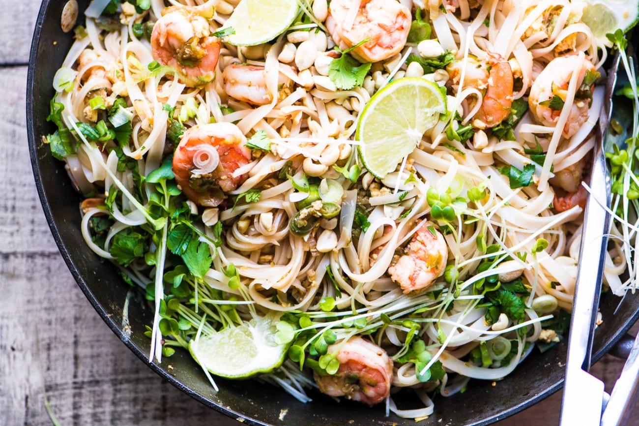 Shrimp Pad Thai es un tazón de fideos salteados a base de fideos hecho con fideos de arroz sin gluten, camarones y todos los sabores tailandeses clásicos como jengibre, ajo, limón y cilantro ~ ¡esta comida supera a la comida para llevar por una milla!