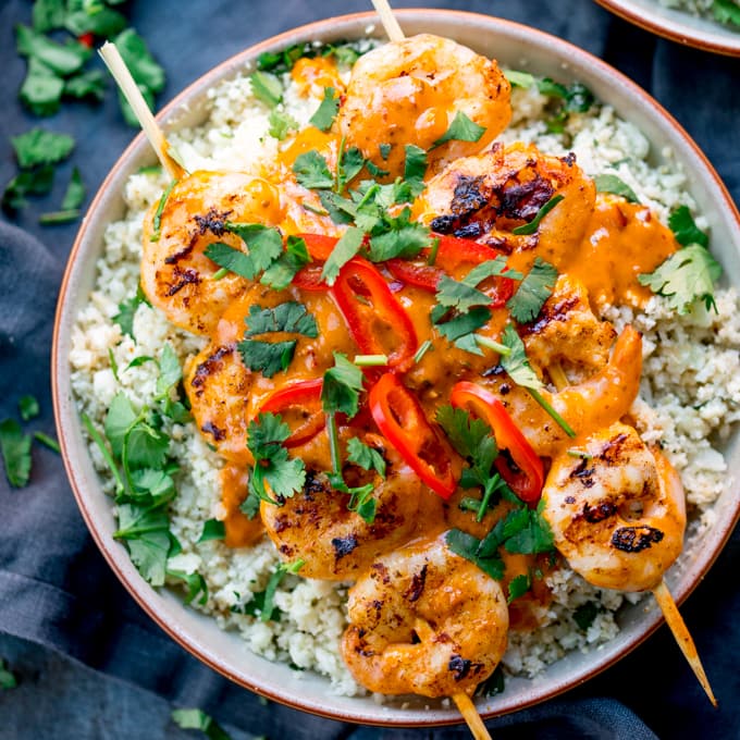 Lo mezclé con un puñado de cilantro picado y un poco de limón en esta receta, lo que realmente agrega sabor. ¡Agregue los camarones cremosos y sazonados y es difícil creer que tiene una comida sabrosa y satisfactoria en la mesa por menos de 250 calorías! Una gran opción si estás en la dieta 5:2 (que hago de vez en cuando).