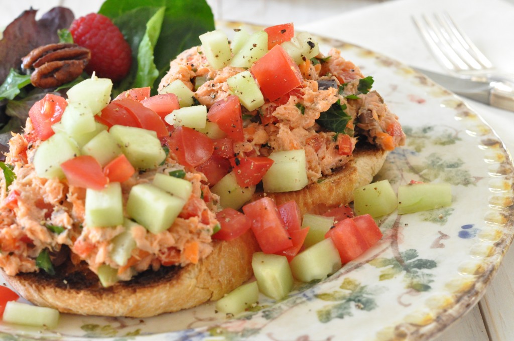 - Coloque el salm贸n sobre rebanadas de pan tostado y adorne con pepino y tomate Roma.