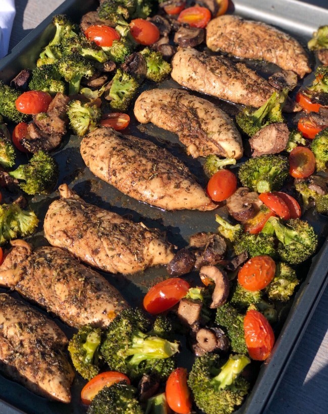 El pollo se marina en un simple adobo de pollo balsámico y se cocina junto con verduras sazonadas. La marinada se hace con aceite de oliva, vinagre balsámico y algunos condimentos para agregar un poco de ralladura. ¡No se deje engañar por los ingredientes simples! Este pollo es jugoso y lleno de sabor.