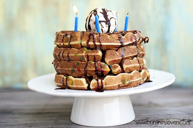 Los gofres de mezcla para pastel son un toque divertido en el postre, ¡pero servirlos para el desayuno de cumpleaños hace que el día sea mucho más especial!