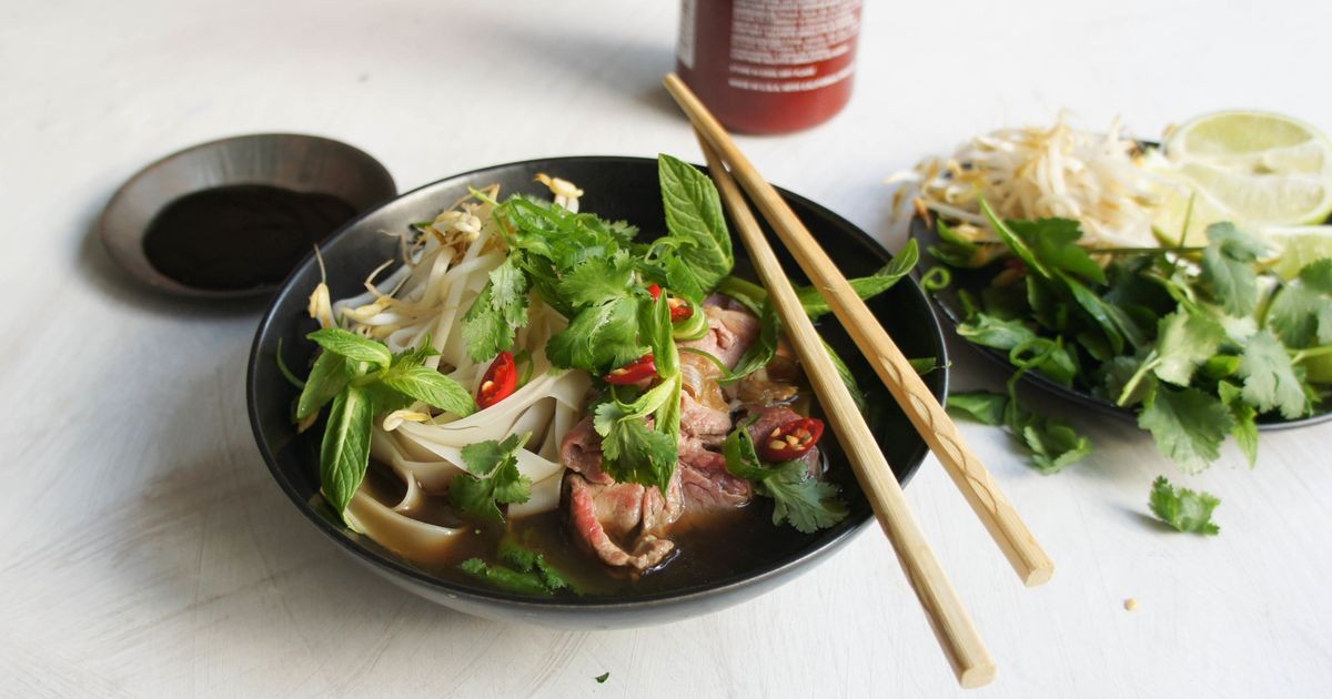 Divida los fideos, los brotes de soja, la carne en rodajas y las hierbas entre dos tazones, luego vierta sobre el caldo y sirva.