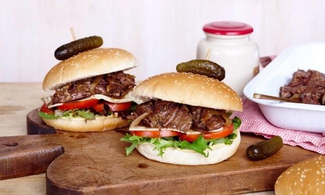 Para servir, rellena los muffins con mostaza, carne, pepinillos, tomate y queso.