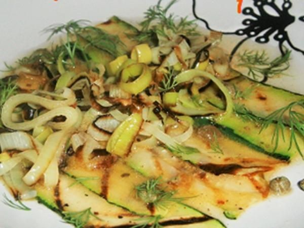 Freír el puerro. Retire de la sartén y deje enfriar un poco antes de colocar encima de los calabacines.