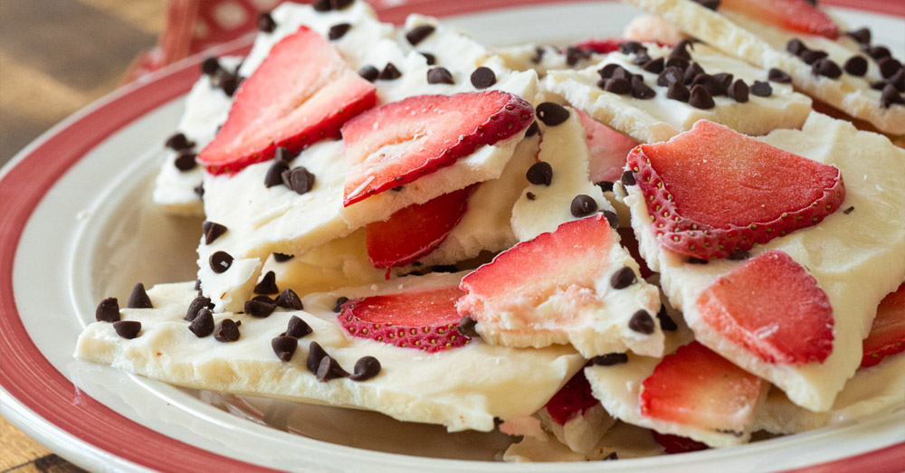 Cuando se trata de bocadillos, es muy fácil tomar una fruta o algo de un paquete, pero a veces es bueno crear algo que se sienta un poco más especial. Eso es exactamente lo que es esta cáscara de yogur: un refrigerio fácil de preparar, pero un escuchar gracias a su dulzura que se derrite en la boca y sus guarniciones de chocolate y fresas frescas. (Puntos de bonificación: ¡también es bueno para ti!)