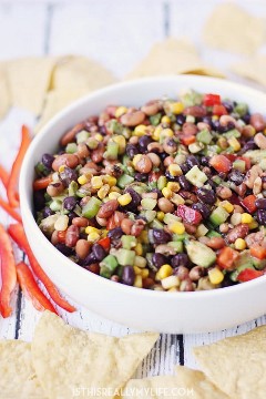 Tal vez sea maíz dulce amarillo y blanco combinado con tres tipos diferentes de frijoles. O tal vez sea el apio, la cebolla verde y el pimiento recién picados. Creo que es todo esto mezclado con un aderezo de vinagre balsámico dulce. ¿Cómo no tener un sabor completamente delicioso?