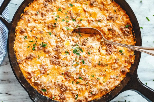 Cazuela de arroz con coliflor cremosa de res: ¡un plato rico y nutritivo de comodidad con un toque saludable! Éste cazuela de arroz con carne y coliflor está cargado de carne molida y vegetales como coliflor, tomate y ajo. Listo en menos de 30 minutos, todos pedirán más de este nutritivo plato bajo en carbohidratos, cetogénico y paleo. ¡Gustar!