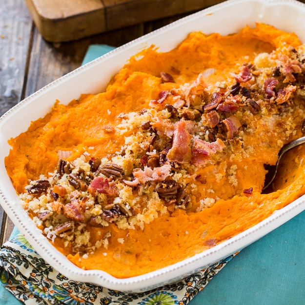 La sabrosa cazuela de boniato se rellena con cebolla, romero y tomillo y se cubre con tocino crujiente y nueces crujientes.