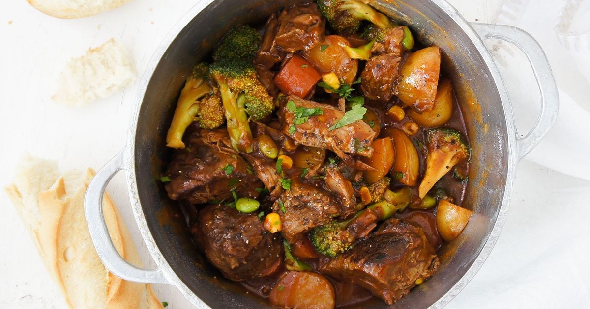 Vierta la sopa sobre la carne y las verduras y mezcle.