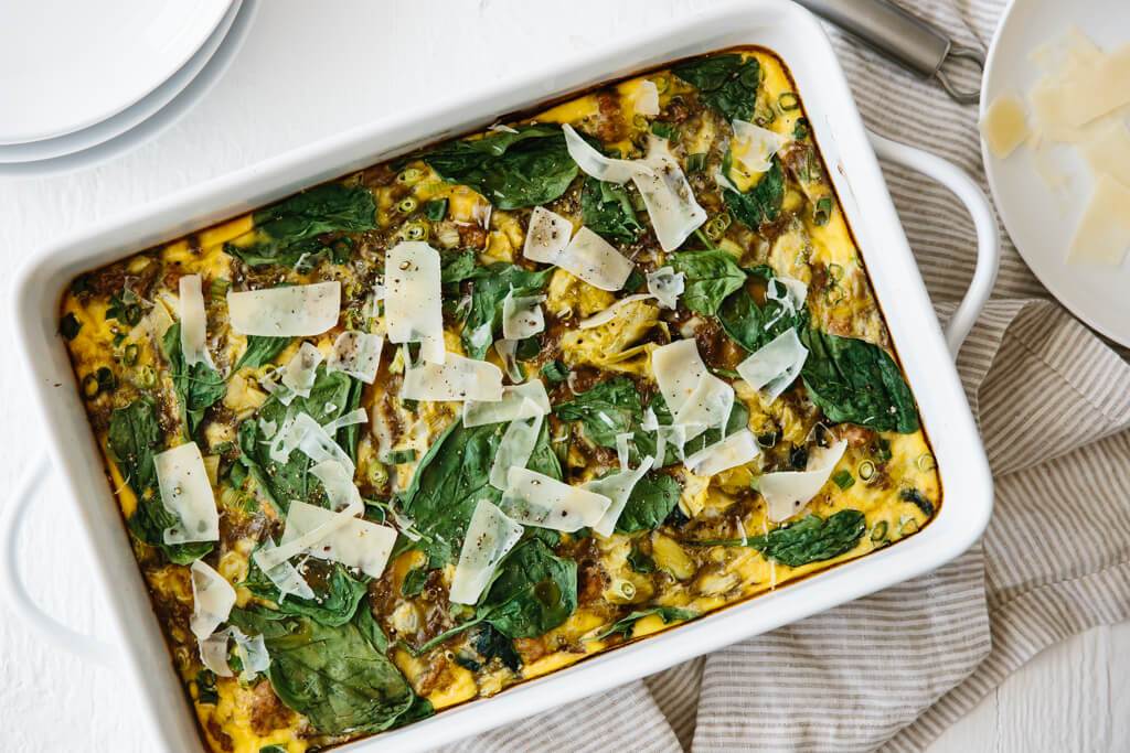 La cazuela de desayuno se rellena con pavo, espinacas, alcachofa, cebolla, pimiento y huevos. Pero si tiene un repollo o una acelga a la mano, siéntase libre de echarlos también. Esta receta es realmente flexible y adaptable.