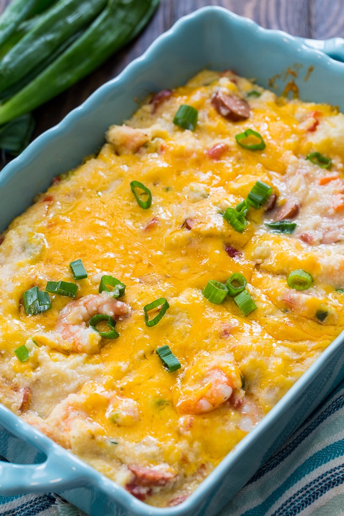 Los camarones y la sémola se convierten fácilmente en una cacerola, lo que la convierte en una maravillosa comida familiar o brunch navideño. Es cremoso, cursi y picante con muchos camarones y salchicha andouille (puedes usar tocino en su lugar).