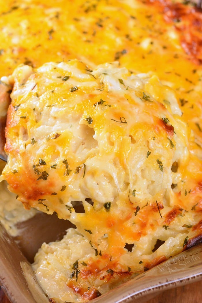 Maravilloso plato abundante de papa cargado con queso cheddar y salsa cremosa. Se prepara fácilmente sin sopa enlatada y se cocina a la perfección.