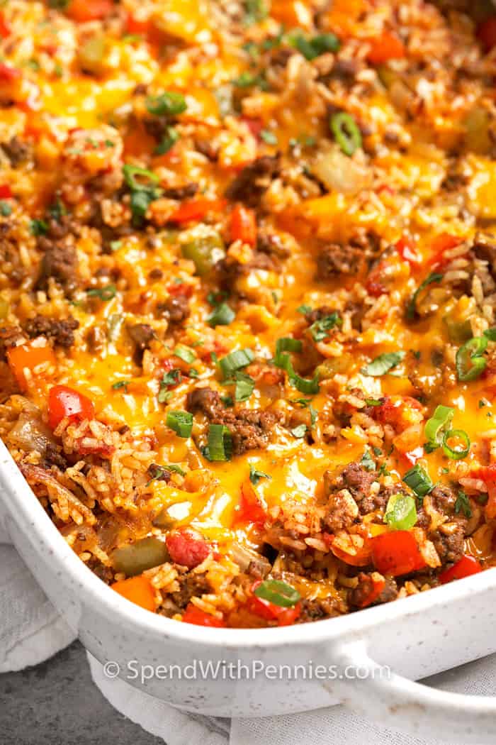 Con queso y carne con un sabor ácido de salsa casera para tacos, ¡esta cacerola tiene el equilibrio perfecto de carne molida, chile, arroz y queso!