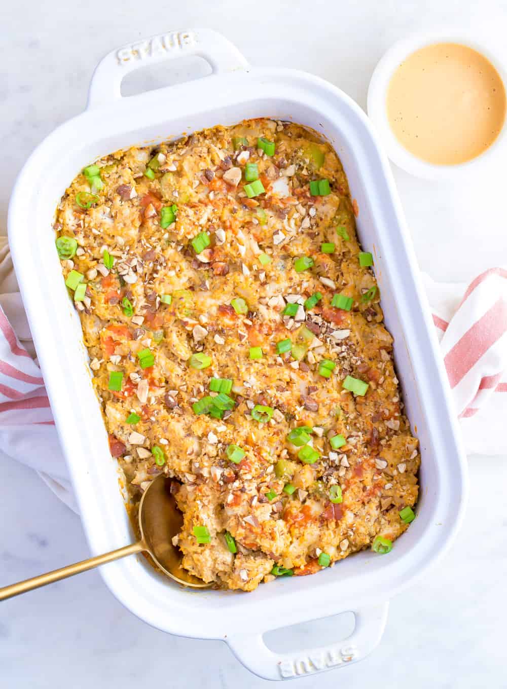 Ahora pongámonos a trabajar armando la fuente para poner en el horno. Comencemos con la capa de arroz de coliflor en el fondo de una olla grande de 9 × 13. Ahora vamos a colocar en capas la mezcla de pollo y vegetales. Vierta la salsa de búfalo encima y mezcle bien. Cubra con almendras picadas para un crujido adicional. Esto será similar a una sensación de “migas de pan”. ¡Coloque en el horno y hornee por 25 minutos! Desplácese hacia abajo para ver la receta completa.