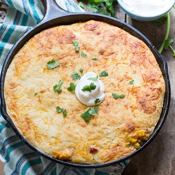 Este pastel de pollo mexicano tiene un relleno de pollo cremoso y una cubierta de pan de maíz con queso. Es una comida maravillosa entre semana y puede comenzar de principio a fin en 30 minutos.