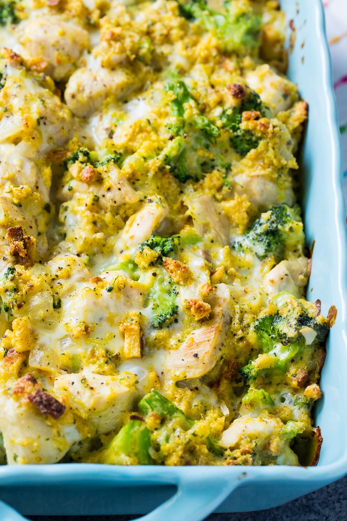 La cazuela de pollo y brócoli con queso es una cazuela fácil rellena con pan de maíz y dos tipos de queso. ¡Hay pollo y brócoli en cada bocado!