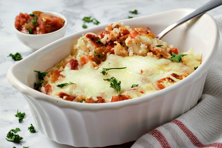 Estos guisos de pollo y arroz con salsa de queso tienen capas de arroz esponjoso cubierto con pollo sazonado mexicano cortado en cubitos, salsa espesa y queso Monterey Jack derretido.