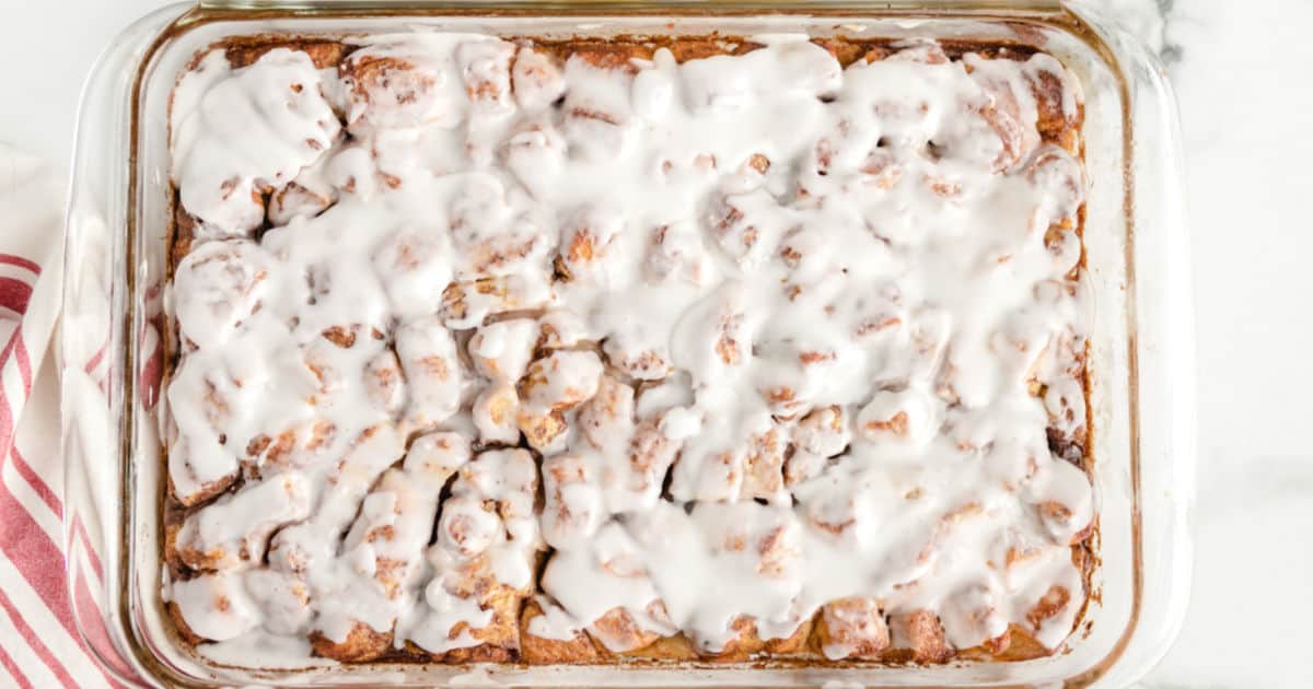 Imagínese despertarse con los deliciosos olores de los rollos de canela horneados en el horno. Así que imagine su deleite cuando llegue a la mesa para ver esos rollos de canela llevados al siguiente nivel y transformados en un decadente rollo de canela en una cacerola cubierta de hielo con una guarnición de almíbar.