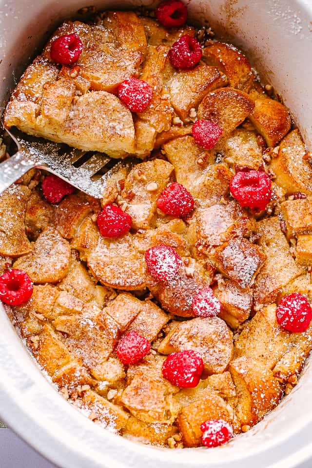 ¡Cazuela de tostadas francesas caliente, dulce y deliciosa hecha en la olla de cocción lenta!