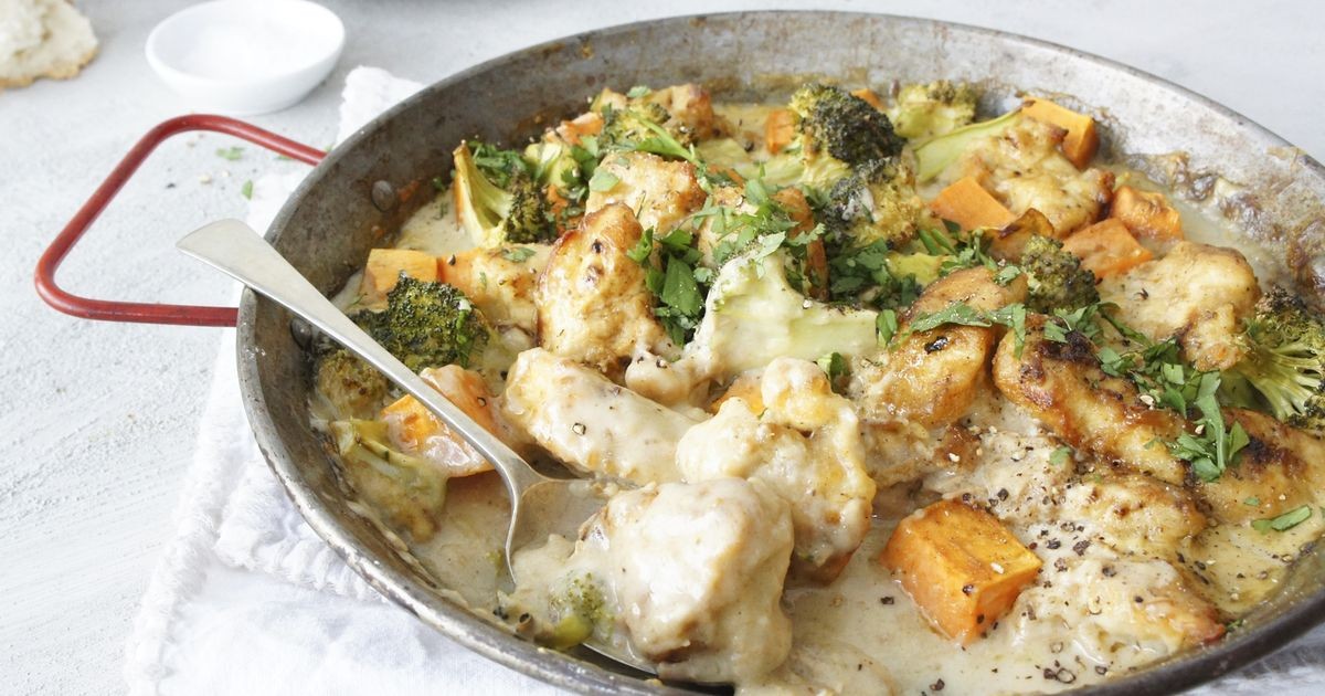 Colocar en una sartén y agregar las verduras. Vierta la crema de pollo sobre las verduras.