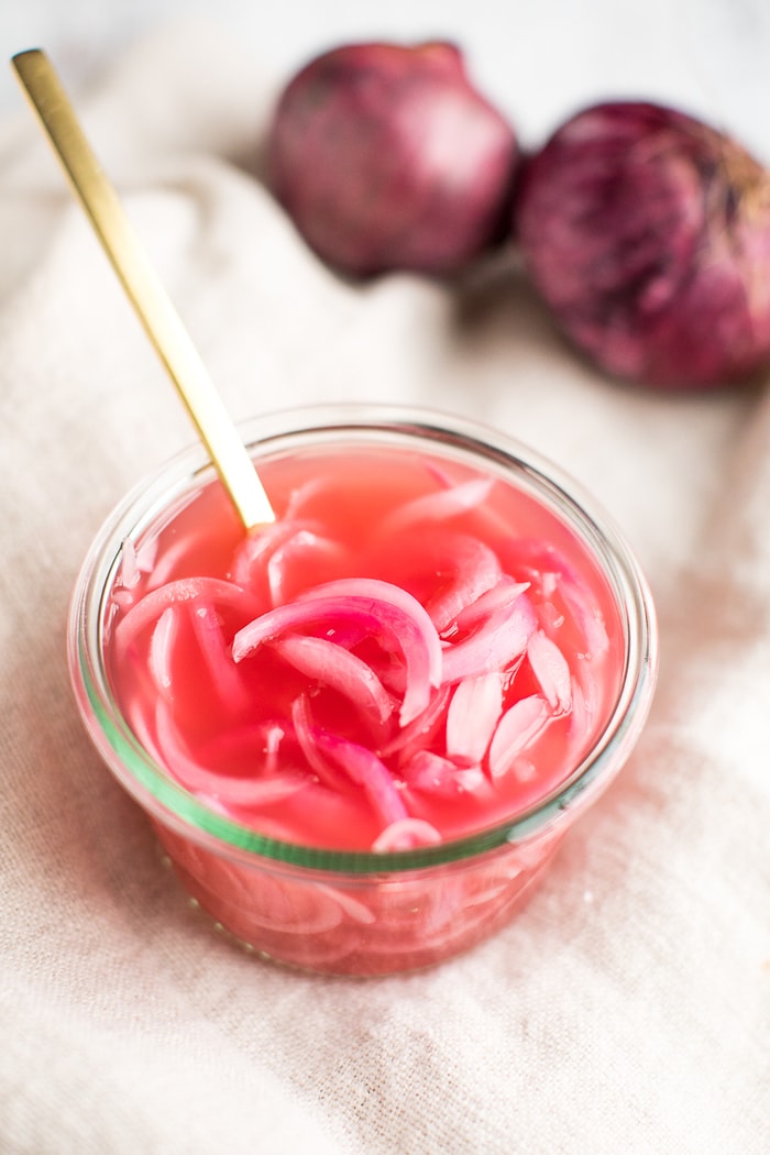 ¡Cebollas en escabeche hechas con solo cinco ingredientes y hechas en solo una hora! Son excelentes para agregar color y sabor divertidos a una amplia variedad de alimentos, especialmente a las ensaladas.