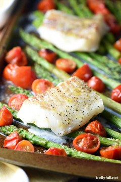 Mezcla los espárragos y los tomates cherry con el aceite; extender en la sartén. Coloque los filetes de bacalao encima.