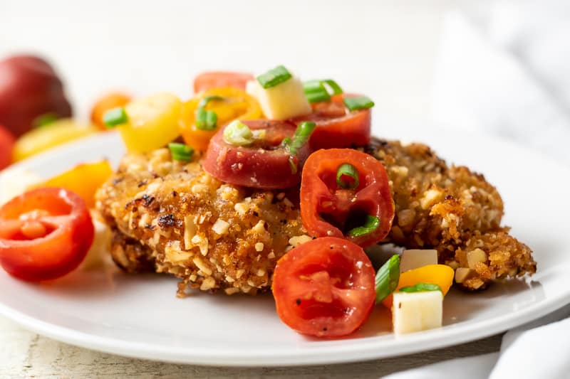 Esta ensalada de pollo con costra de almendras y tomates italianos frescos es una comida rápida y fácil entre semana y también es lo suficientemente elegante para una cena o almuerzo romántico para dos.