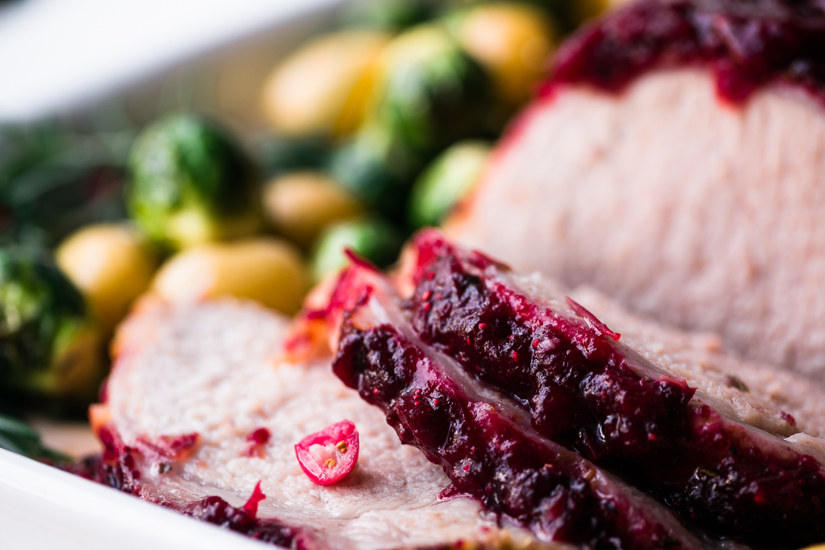 My Cranberry Glazed Pork Roast es un suculento lomo de cerdo asado con un toque de mostaza de romero y cubierto con arándanos y glaseado agridulce. Solo lleva una hora en el horno… ¿ya tienes hambre?