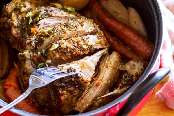¿Te gusta lavar los platos? ¡Lo mismo para nosotros! ¡Esta es solo una de las mejores cosas de este asado de vegetales! A medida que el cerdo se cocina lentamente, la grasa disminuye gradualmente, rociando el asado y liberando literalmente las tiernas tiras de carne salada, zanahorias dulces y papa. Este asado de cerdo se calienta aún mejor al día siguiente. ¡Una manera deliciosa de preparar la cena en el plato!