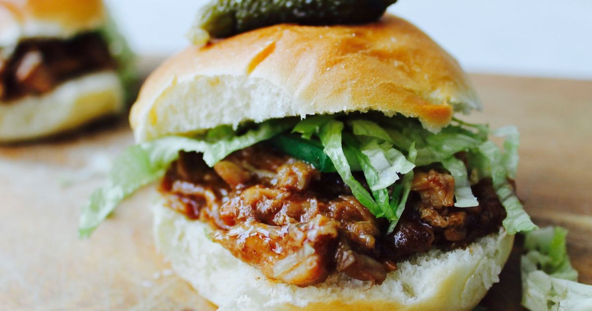Sirva la carne de cerdo picada en los controles deslizantes con pepinillos, lechuga y ensalada de repollo rojo.