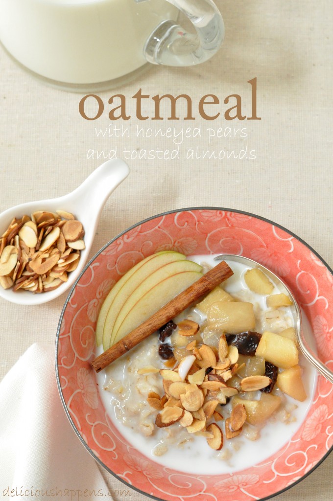 Sirva la avena en tazones y cubra con peras caramelizadas y almendras tostadas.