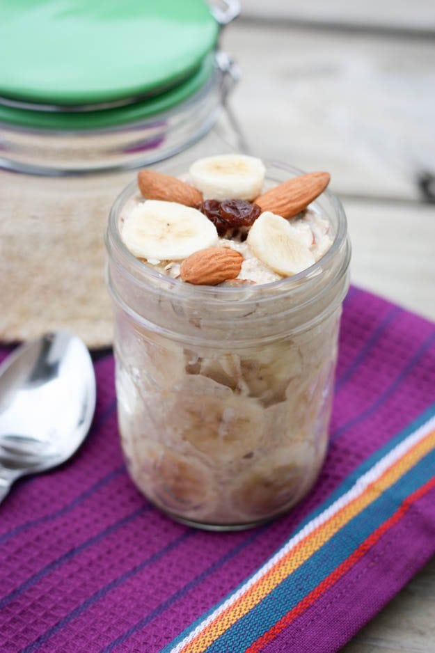 La harina de quinua, la avena, la leche de almendras sin azúcar, la proteína en polvo, las almendras en rodajas y las pasas se agregaron a la mezcla. Puse la mezcla en el refrigerador durante la noche y me desperté con un cereal espeso lleno de proteínas durante la noche. Definitivamente es más densa que la avena regular durante la noche y contiene más de 15 gramos de proteína por porción.