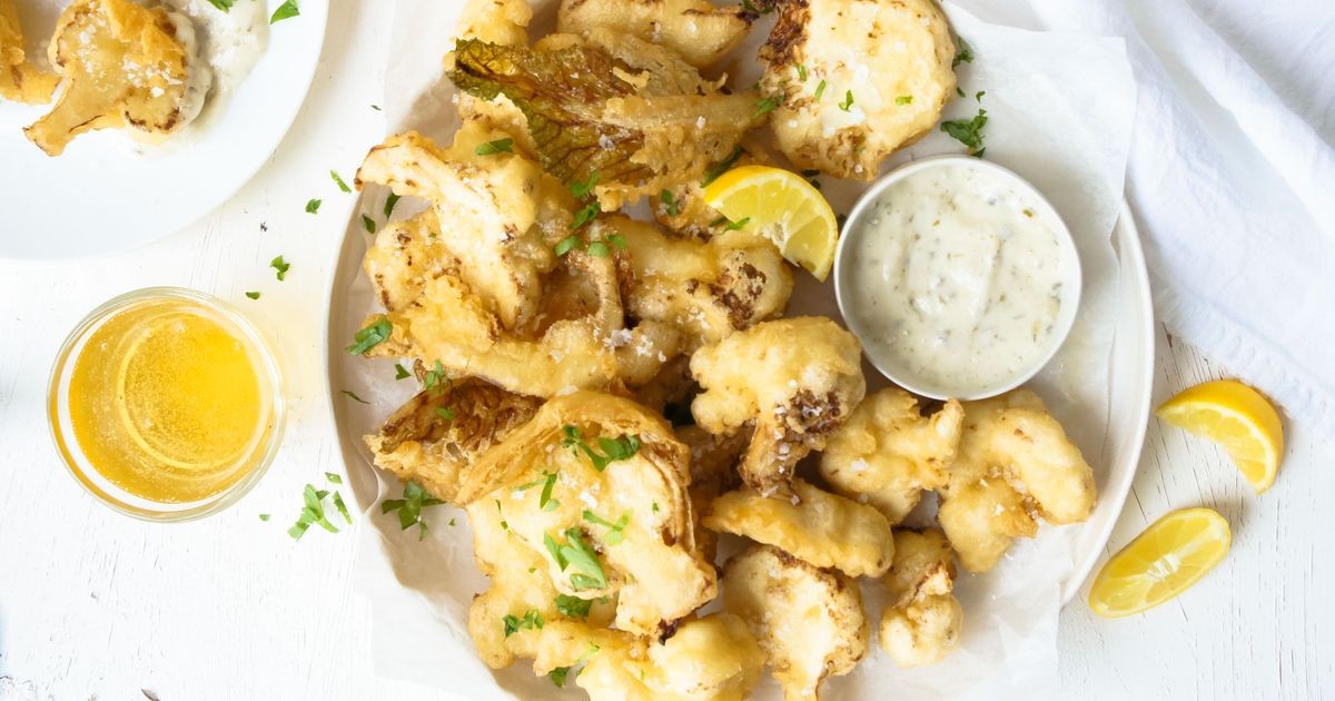 Vierta suficiente aceite para levantar un tercio del lado de un wok o una olla grande. Caliente a fuego alto hasta que el termómetro de un cocinero alcance los 180 ° C. Agregue la coliflor a la masa y mezcle bien para cubrir.