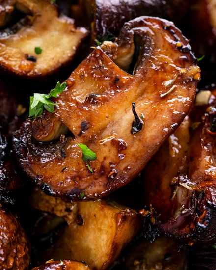 Champiñones asados, mezclados con una combinación de ajo, vinagre balsámico, hierbas secas y aceite de oliva, y asados hasta que estén tiernos pero caramelizados.