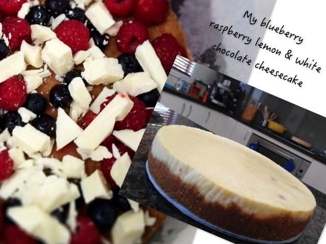 Espolvorea la base de galletas de manera uniforme con chocolate blanco, arándanos y frambuesas. Vierta sobre la mezcla de queso crema. Golpee suavemente la sartén para fijar la mezcla.