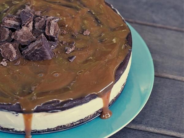 Para servir, suelte el pastel de queso de su molde desmontable y sírvalo en un soporte para pasteles o en un plato bonito. Debe servirse a temperatura ambiente. Espolvoree la ½ taza restante de caramelo salado sobre el pastel de queso, dejándolo correr por los bordes, y cúbralo con algunos trozos de Tim Tam triturados.