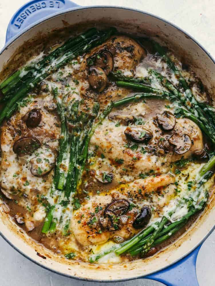 Regrese el pollo a la sartén con los espárragos. Cubra con el queso y hornee hasta que se derrita y burbujee. Sirva sobre puré de papas, si lo desea.