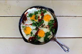 Freír los cuatro huevos con la parte soleada hacia arriba.
