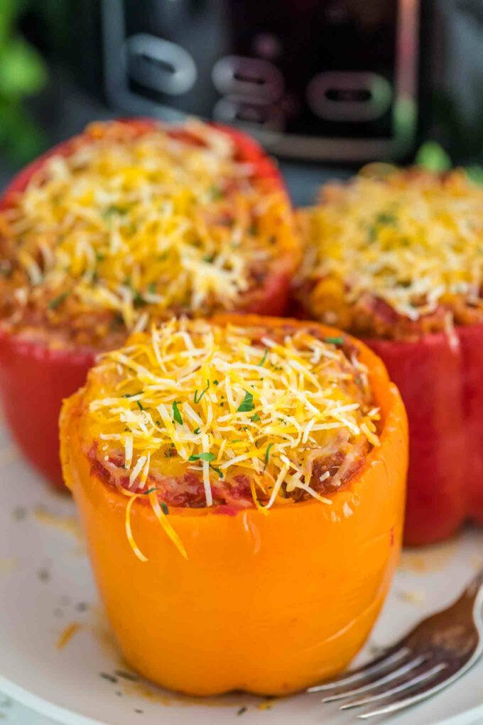 - Finalmente, cubra y cocine a temperatura BAJA durante 5-6 horas o hasta que los pimientos estén tiernos y el relleno esté completamente caliente.