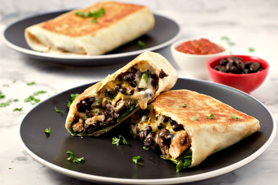 ¡Estas chimichangas de pollo crujiente y frijoles negros son rápidas y fáciles! Las chimichangas generalmente se fríen, pero este método es rápido y da como resultado una tortilla igualmente crujiente con un relleno satisfactorio de pollo, queso y frijoles negros.