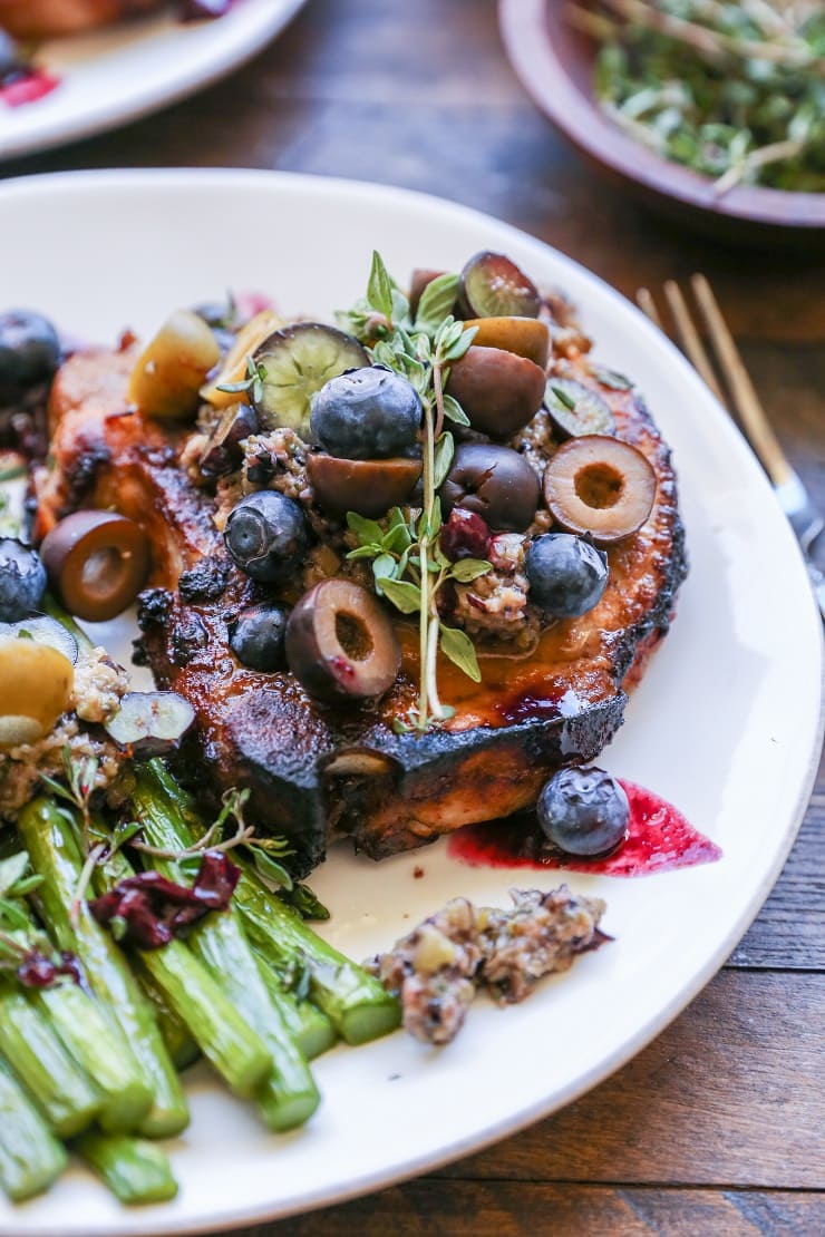 Chuletas De Cerdo Con Arce Balsámico, Arándanos Y Aceitunas Tapenade