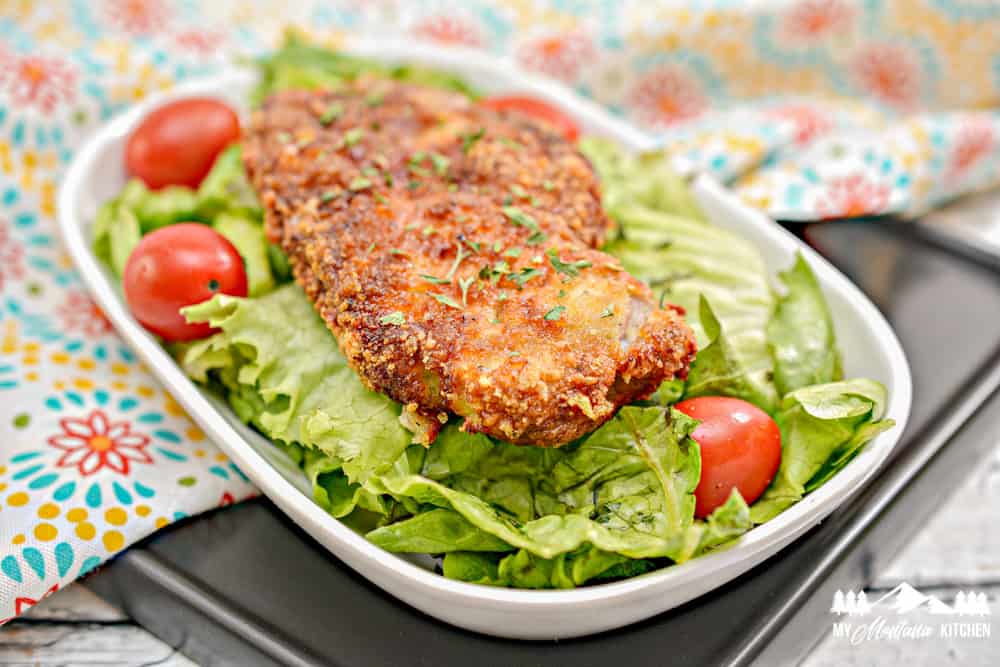 Como las freidoras cocinan por convección, es importante hacer circular el aire sobre toda la superficie de estas deliciosas chuletas de cerdo con queso parmesano.