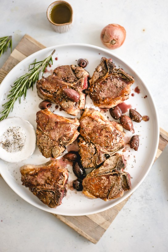 Saque su sartén de hierro fundido y haga estas deliciosas chuletas de cordero a la parrilla con hermosas costras y suculentos cubos. Desglasar la sartén con vino tinto seco y mezclar una salsa de sartén rápida de vino tinto con sabores como ajo y cebollino y fragante, romero de pino y tomillo. Para terminar, sirva el plato con un puñado de ricas y afrutadas aceitunas Kalamata.