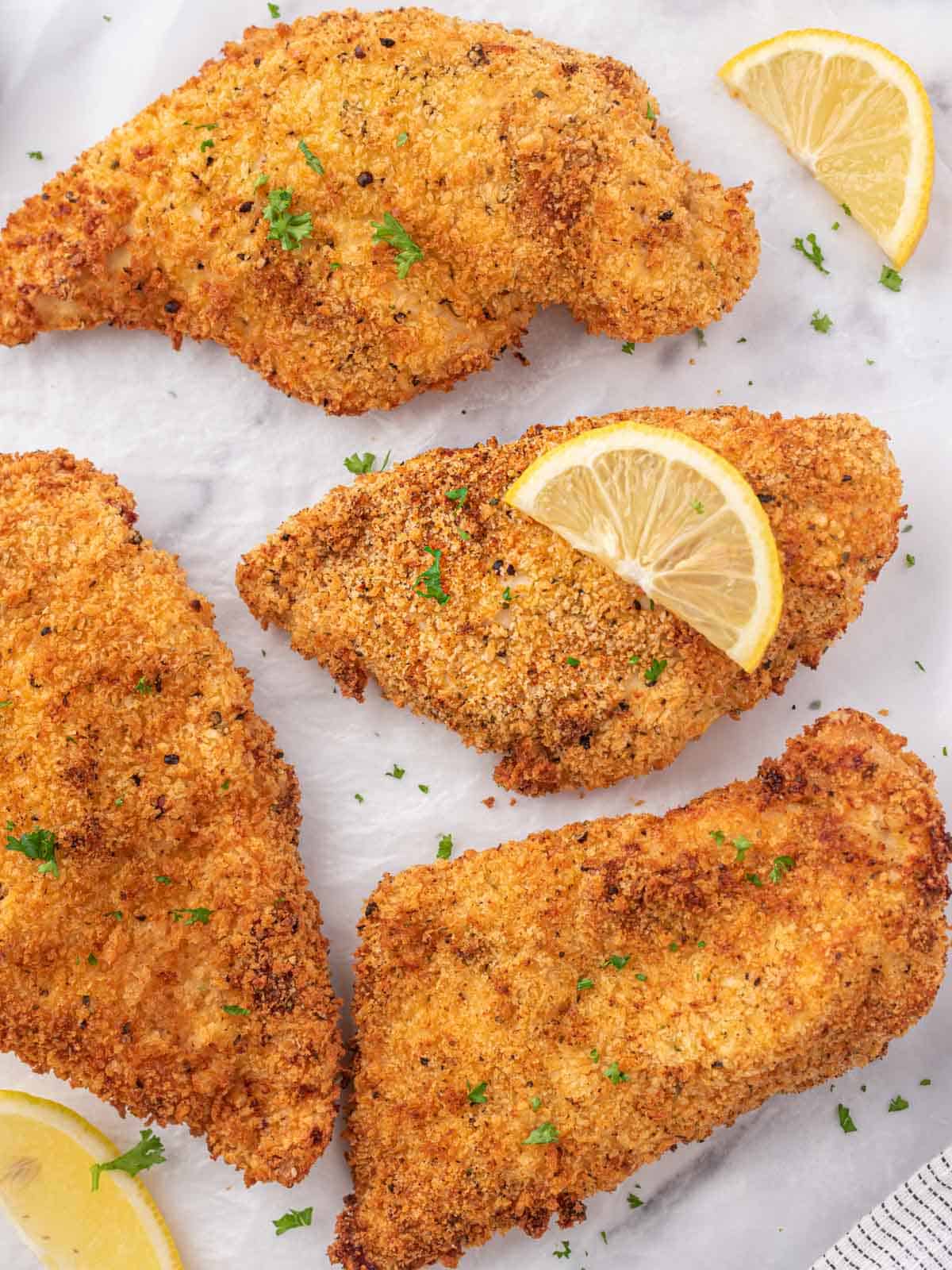 - Espolvorea con perejil y sirve las chuletas de pollo crujientes con rodajas de limón al lado.