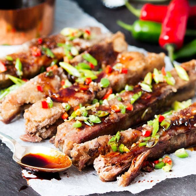 Estas costillas se desmoronan con una capa ligera y crujiente. Cubiertos con una salsa picante pegajosa, ¡son tan deliciosos!